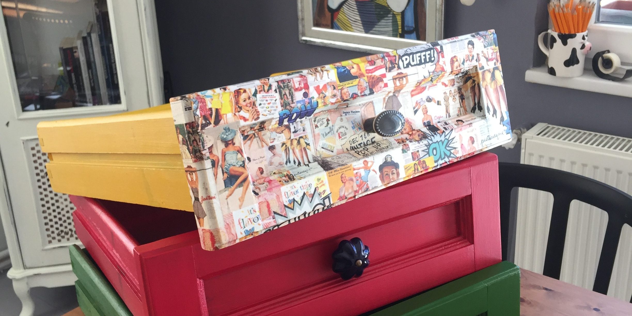 Fotoğraftaki çekmeceler yaklaşık yirmi sekiz yıllık. Ankara, Gazi Osman Paşa, Kaptan Paşa Sokaktaki evimizin mutfağından… Üniversiteye başlarken taşındığımız, apartmanın müteahhidi babam olduğu için her sıkıntıda kapısı çalınan, gelin olduğum, iki sokak yukarıda Uğur Mumcu cinayetinin acı patlamasını duyduğumuz ve nice anıların yaşandığı evimizden. Yeni mutfak yaptırdıkları halde annemin de atmaya kıyamadığı, bir zamanlar çok moda olan maun kaplama çekmecelerdi. Ziyarete gittiğim bir tarihte talip olmuştum bu çekmecelere. İki senedir atölyemde bekliyorlardı. Bir süredir yaptığım tadilatta, koçluk seansları için ayırdığım odamı “Dükkan”a çevirmeye karar verince yerlerini buldular. Seanslar başka bir odaya taşındı. Çekmeceler, Atölye Zanatçılarına (yazım hatası yok) hayallerindeki eserleri ortaya çıkarmalarına yardımcı ürünler sunacaklardı.